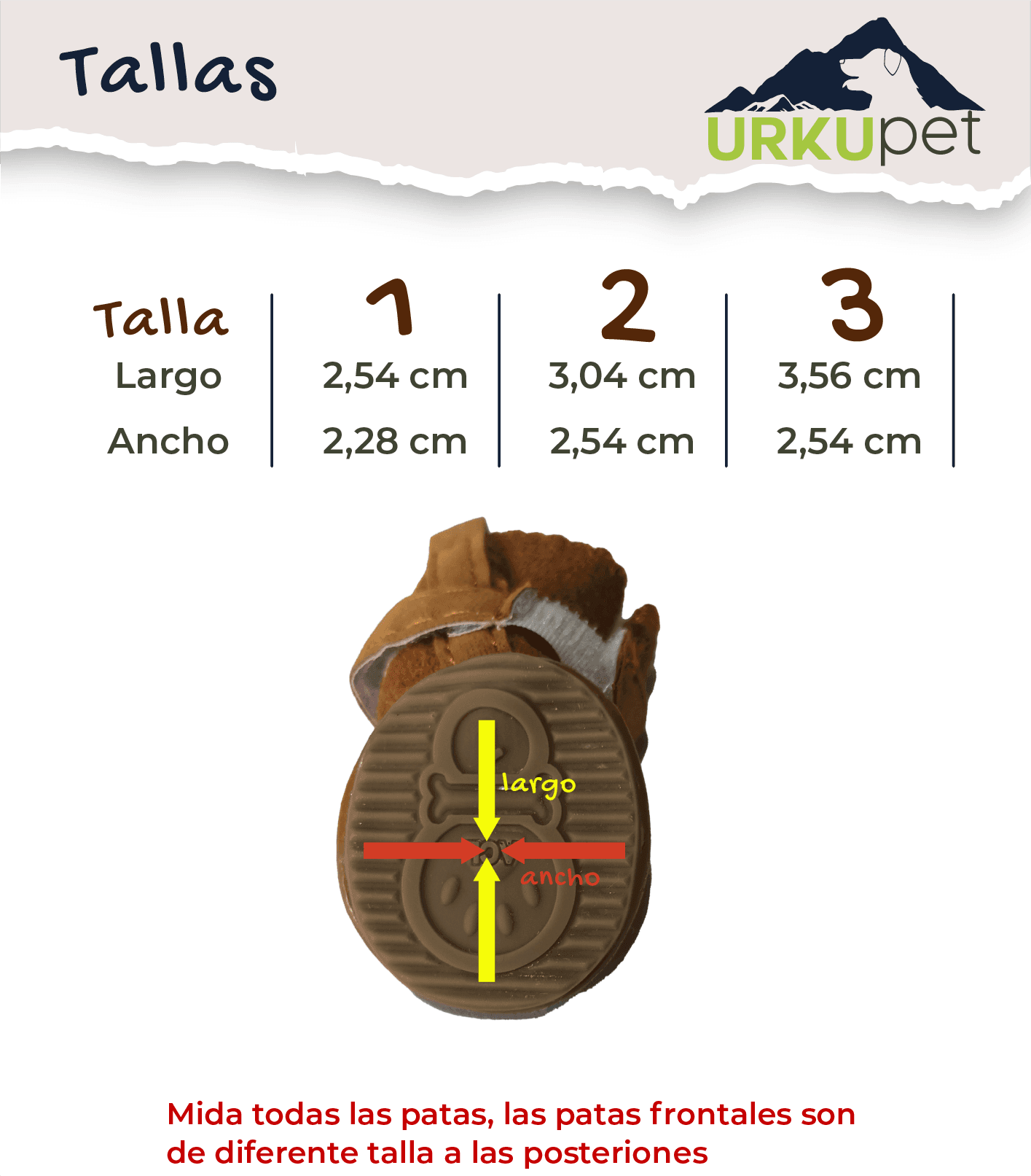 - Las tallas suelen quedar pequeñas. Elige 0.4 pulgadas más que el tamaño de la pezuña de tu perro